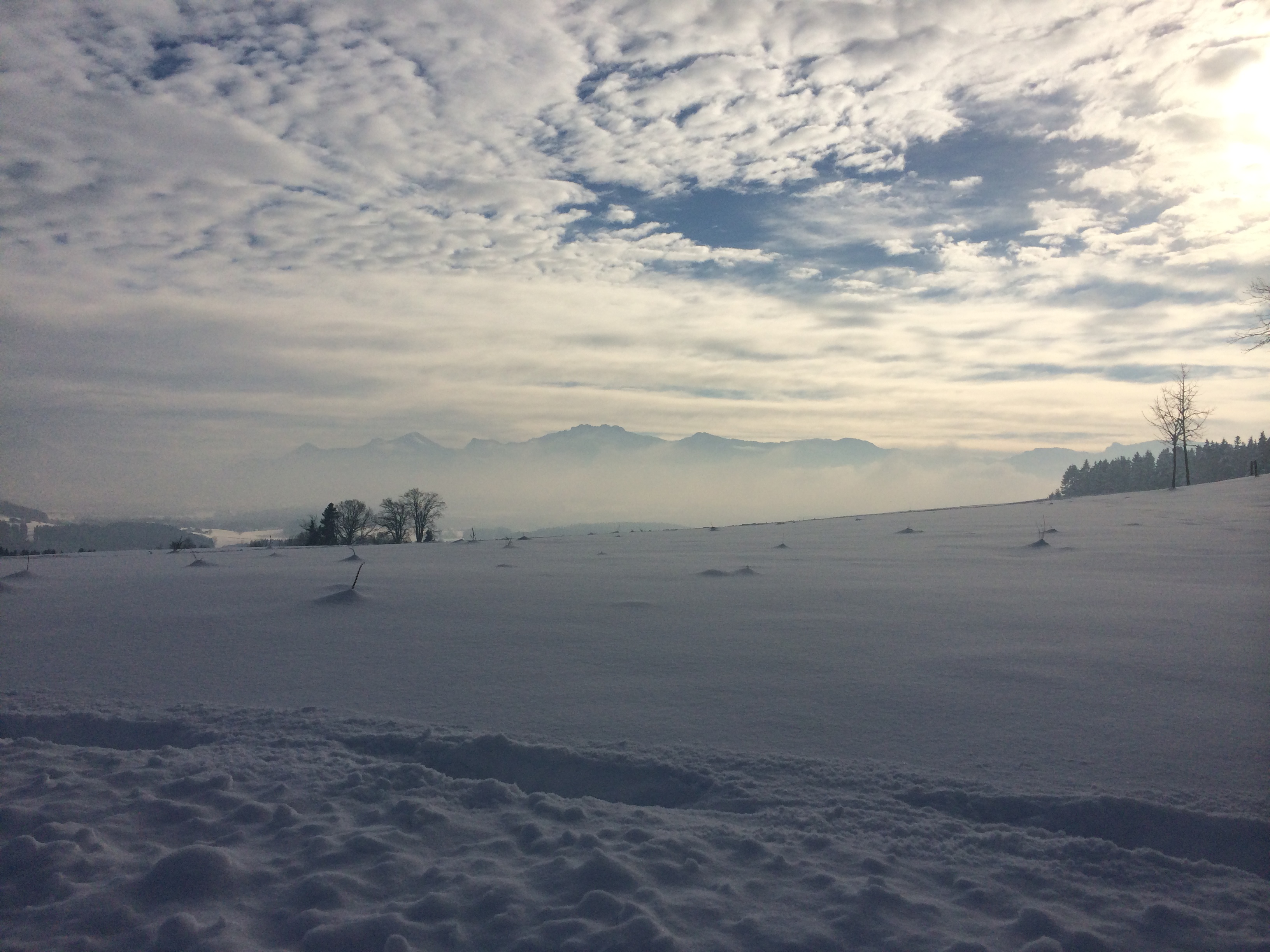 Der winterlich verschneite Aussichtspunkt, der in diesen Tagen alle Register einer neuen Aussicht zieht, war Cicero wahrscheinlich völlig unbekannt. Wiesen und Felder sind behütet und geschützt durch eine dicke Schneeschicht, Häuser präsentieren sich mit rauchenden Kaminen als behaglich warme Ruhepole der Landschaft. Hinter Fassaden, geschmückt mit Tannengrün und Zapfen aus dem benachbarten Waldstück, trotzen sie den äusseren Temperaturen und dem eisigen Wind, der über die Bergkuppe fegt. Der Ausblick auf die Alpenkette, die sich hinter den Nebelschwaden erkennen lässt, erzeugt vielleicht ein leises Gefühl von Fernweh – die Sehnsucht, neue Höhen und Gipfel zu erklimmen, prägt die Zeit des Jahresanfangs. Und doch verunsichert die Aussage des Philosophen manche Menschen. Sie klammern sich an bestehende Umstände, scheuen den Neu-Start und vermeiden es, weitere Schritte und Spuren zu setzen…
