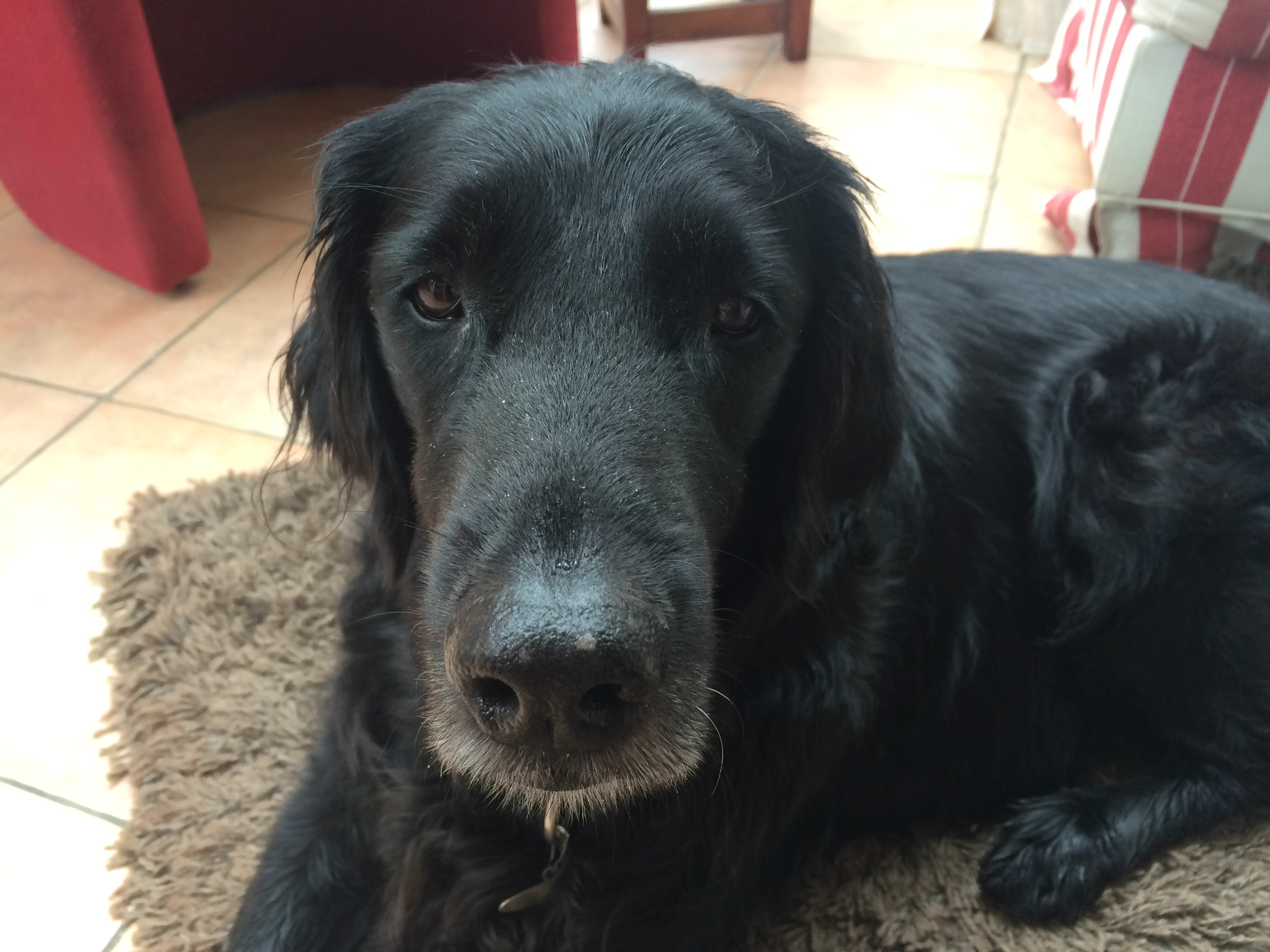 Die nächsten Tage vergingen mit den letzten Vorbereitungen für Lanas Einzug wie im Flug und gleichzeitig wuchs die Aufregung, sie endlich nach Hause zu holen. Die Hundehaare hatte ich in eine kleine Glasdose gelegt und ab und zu schnupperte ich daran, um auf keinen Fall zu vergessen, dass es bald eine neue Hunde-Wirklichkeit geben würde. An einem sonnigen Wochenende im Herbst war es dann soweit! Nach einer gut 2-stündigen Autofahrt, die mich auf kurvigen Straßen tief in den bayrischen Wald führte, kam ich endlich beim Züchter an. Als dann die Formalitäten erledigt waren, legte ich dem schmalen, kleinen Hundehals sein erstes Halsband an. Es war leuchtend rot und bot einen tollen Kontrast zum pechschwarzen Fell. Ein bisschen groß war es vielleicht noch aber das würde sich ja bald geben. Lana stand mit zittrigen Beinchen vor uns, allerdings spürte sie genau, dass jetzt wohl endgültig der Abschied von ihren Geschwistern bevorstand und sie den Holzstadl verlassen durfte. Sie hatte es sich mittlerweile schwanzwedelnd zwischen meinen Beinen gemütlich gemacht hatte, so als wollte sie darunter Schutz suchen und versichern, dass die Entscheidung nun getroffen und gut war. Lana gehörte ab sofort zu mir!