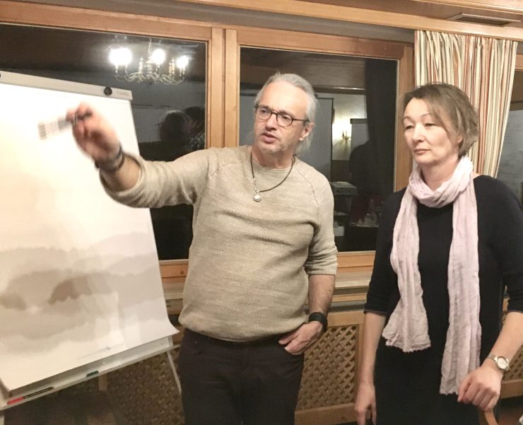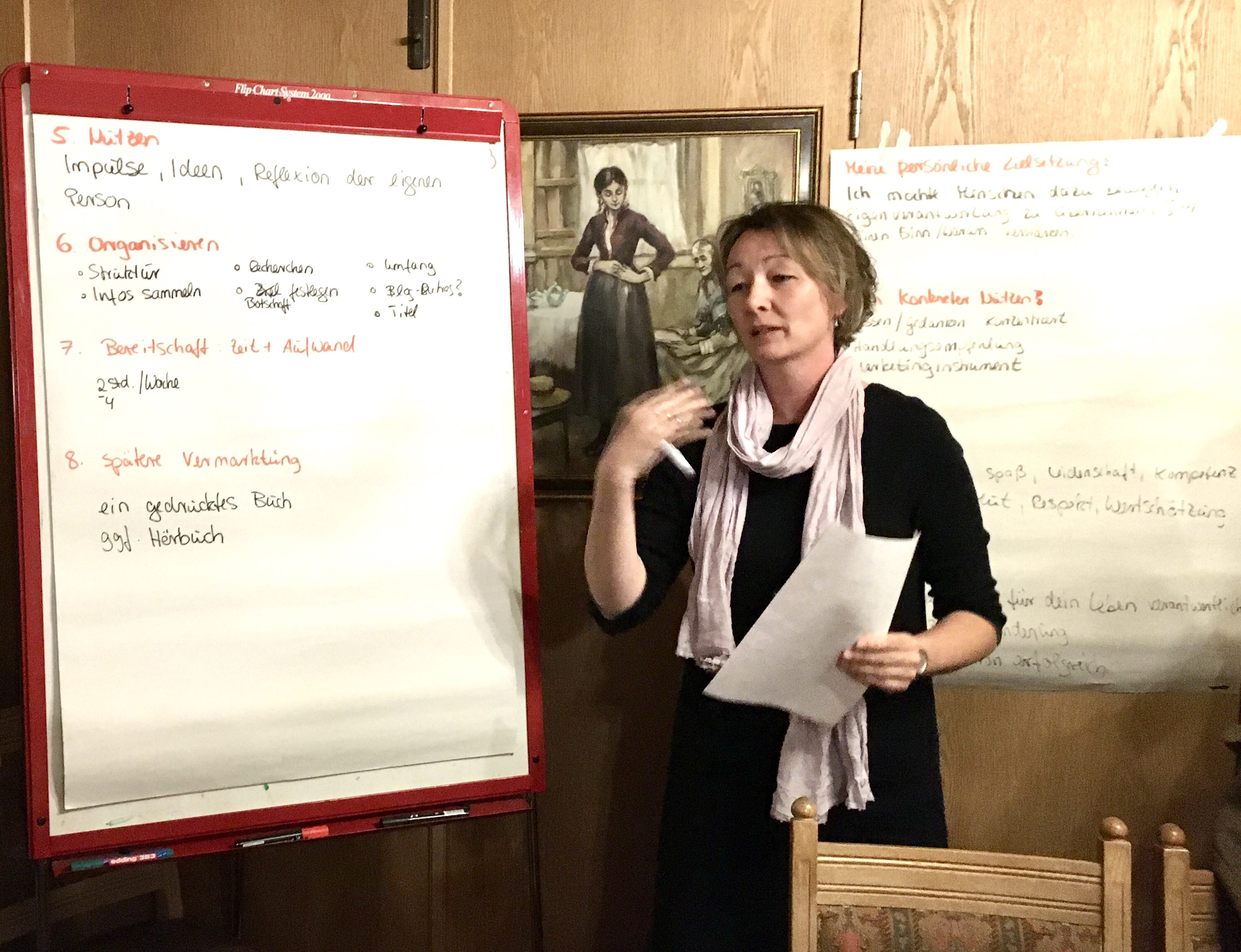 Im zweiten Teil des Abends erfuhren die Teilnehmer, wie sie ihr Buchprojekt nach der Erarbeitung erster Stichpunkte erfolgreich fortsetzen können. Auf Flipcharts und in bunten Mindmaps wurden eifrig Ziele und wichtige Botschaften des zukünftigen Werkes notiert. Und der zu erwartende Nutzen für den potentiellen Leser und den Autor formuliert. Diese Antworten zeigten sich als hilfreiche Bausteine im jeweiligen Vorgehen. Sie stellen die Grundpfeiler dar, die dabei helfen, das Projekt, Schritt für Schritt voranzubringen. In einem zeitlich abzuschätzenden Rahmen und mit dem dafür nötigen Aufwand.